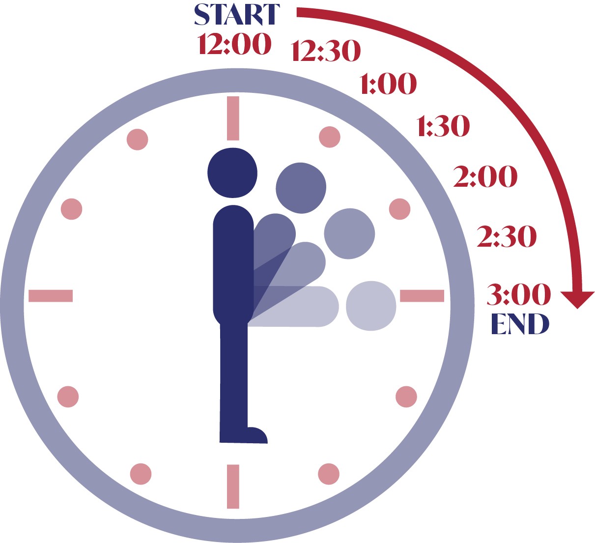Your starting point is Standing straight (12:00), your ending point is bending forward by move your head towards the ground to 3:00 – without pain.